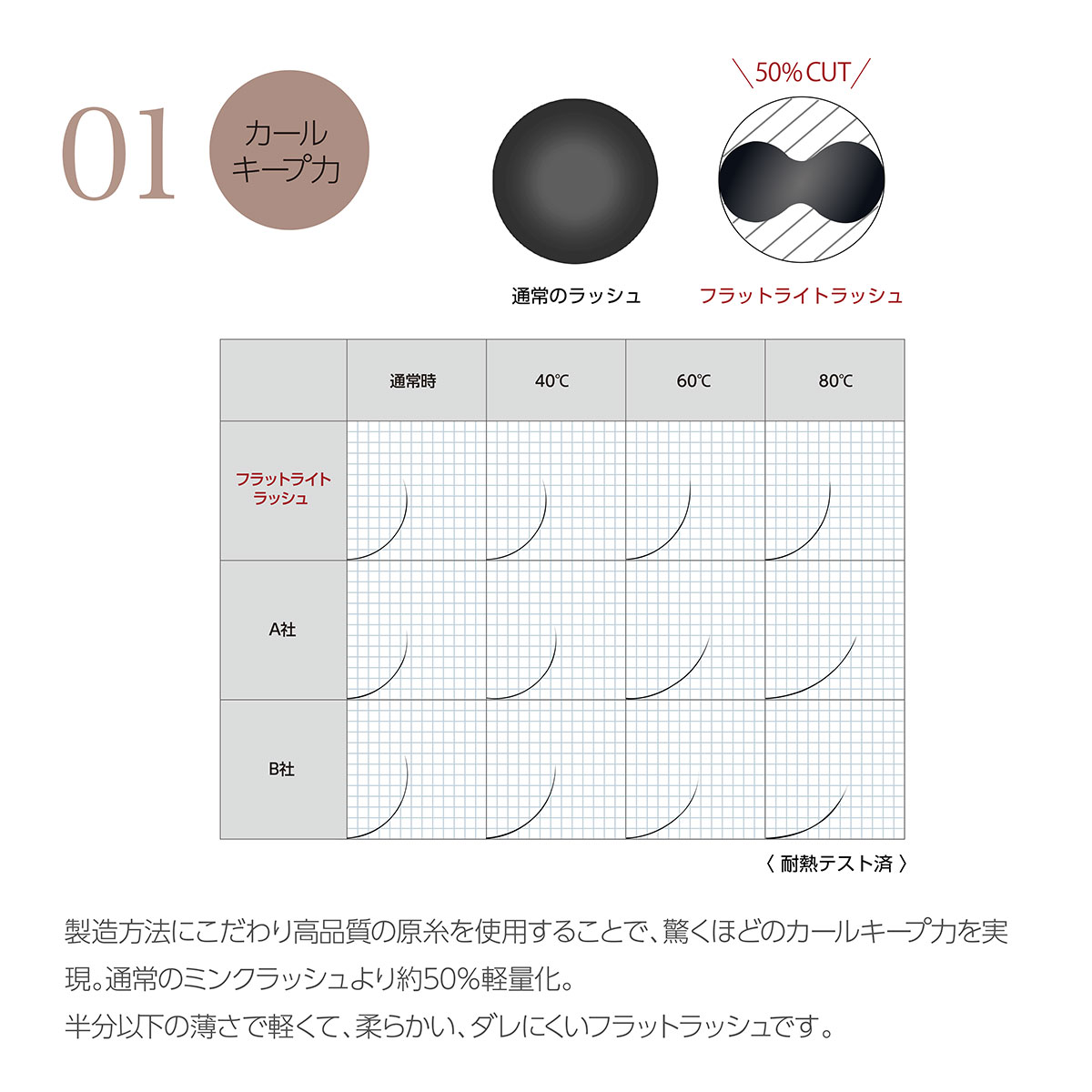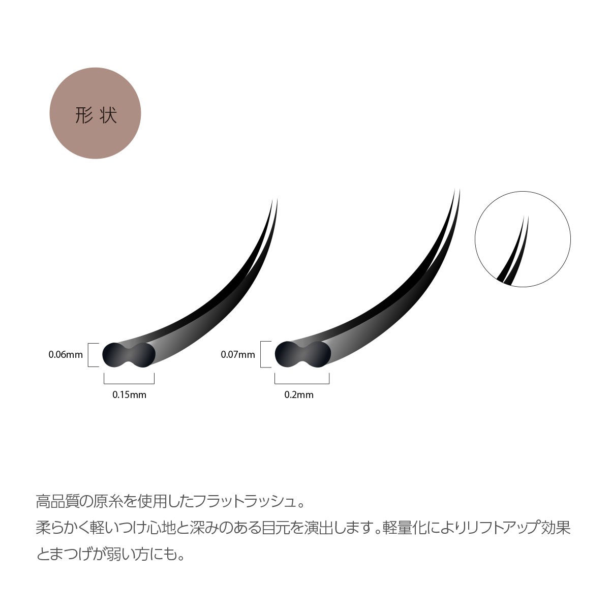 - :高品質の原糸を使用したフラットラッシュ。柔らかく軽いつけ心地と深みのある目元を演出します。軽量化によりリフトアップ効果とまつげが弱い方にも。